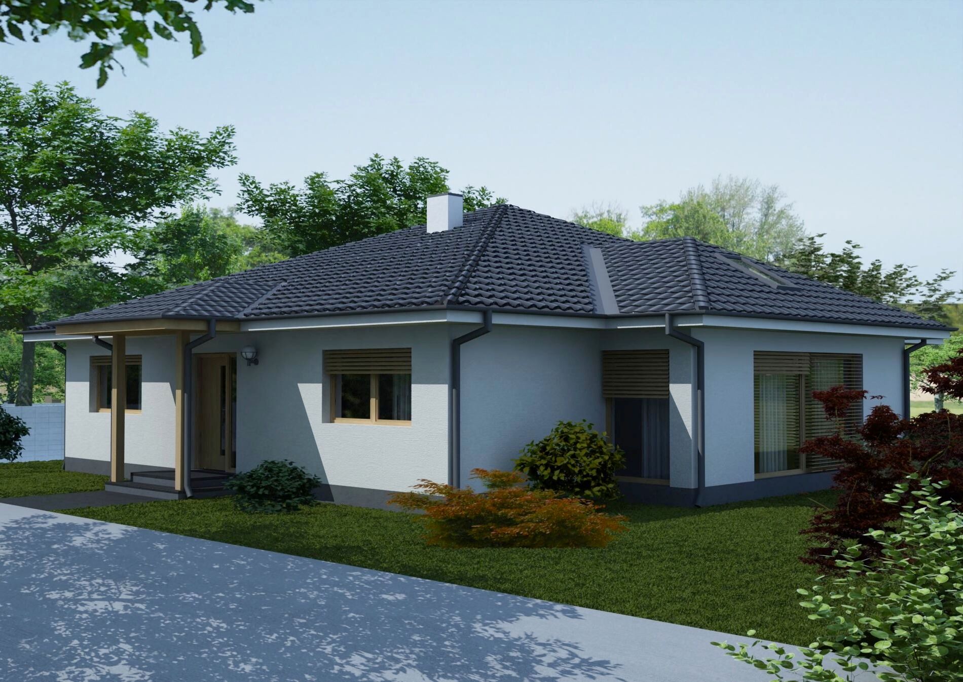 Väčší dom pre 4-5 ľudí s otvoreným priznaným podkrovím v obývačke, presvetlený francúzskymi oknami. Bungalov 1002 je strednej veľkostnej kategórie vhodný pre štvorčlennú až päťčlennú rodinu. Dennú časť domu tvorí otvorená dispozícia priestrannej obývacej izby a jedálne so samostatne odčlenenou kuchyňou. Obývací priestor je presvetlený veľkými francúzskymi oknami s východom na terasu a otvoreným priznaným podkrovím. Nočnú časť tvorí spálňa rodičov, dve detské izby a priestranná kúpeľňa. Na chodbe je veľká úložná vstavaná skriňa. Technická aj úložná miestnosť je umiestnená v podkroví, prístupná sklápacím schodiskom z chodby. Výhodou domu je taktiež to, že okrem obývacej izby aj ďalšie dve izby môžu využívať výhody prístupu na terasu a záhradu. Typickým znakom tohto rodinného domu sú veľké presklené plochy, ktoré pri správnom osadení výrazne efektívne využívajú slnečnú energiu k úsporám energií.