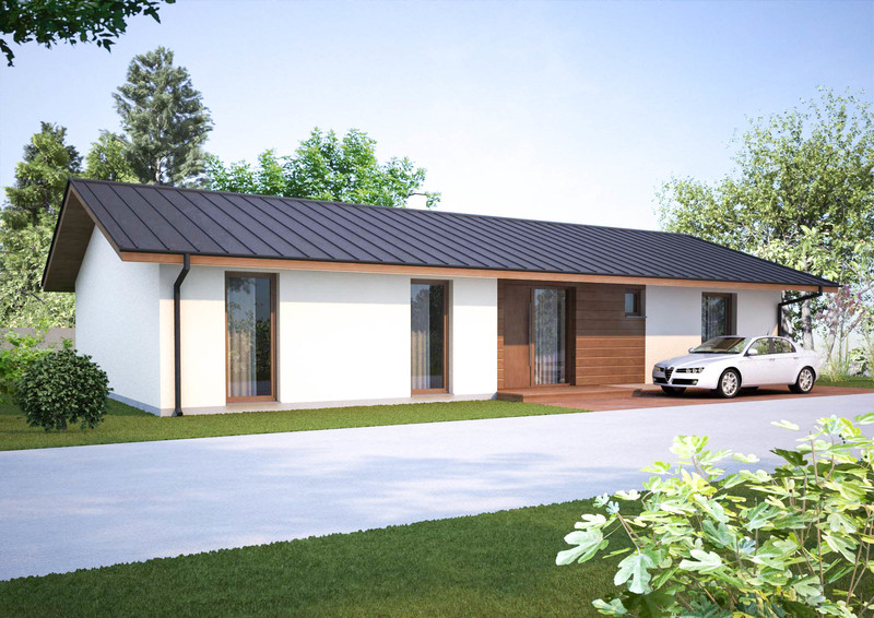 Sympatický bungalov kompaktného pôdorysu pre úzke parcely ponúka efektívnu a účelnú dispozíciu s príjemným dizajnom. Tvarovo jednoduchý, no priestranný 4-izbový dom so sedlovou strechou. Pozdĺžne orientovaný pôdorys si nájde uplatnenie na mnohých pozemkoch a vstup umiestnený z bočnej časti domu umožní v prípade potreby prístup z oboch strán pozemku. Dispozícia je rozdelená na nočnú a dennú časť efektívne prepojených chodbou a vstupom. Kuchynská časť je prepojená s dennou častou barovým pultom a ďalej pokračuje jedálenský priestor, z ktorého je vstup na čiastočne krytú terasu prostredníctvom veľkých presklených dverí. Hĺbku terasy je možné mierne zväčšiť na úkor plochy jedálenského priestoru. K ďalším výhodám dispozičného riešenia patrí komora, technická miestnosť s práčkou, samostatné WC, priestranné vstupné zádverie. Nočnú časť tvoria 3 izby a kúpeľňa s WC. V obývacej izbe zaujme možnosť umiestnenia vstavanej knižnice. Konštrukčne je uvažované s použitím jednoduchého väzníkového krovu. Účelná dispozícia v jednoduchej forme domu pomáha efektívnemu vynaloženiu nákladov na výstavbu.