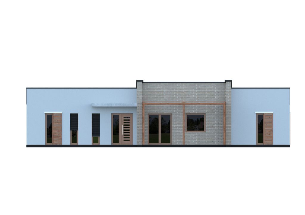 Bungalov moderného otvoreného interiéru s členenou pultovou strechou. Centrálnu časť pôdorysu domu tvorí prepojená dispozícia kuchyne a obývacej izby s vyvýšeným stropom a včlenenou terasou, ktorá spája dennú časť so záhradou veľkými francúzskymi oknami. V ľavom krídle domu sa nachádza hlavná spálňa so samostatným šatníkom a vlastnou priestrannou kúpeľňou. Pravá časť domu je tvorená dvoma izbami, šatníkom, kúpeľňou, WC a technickou miestnosťou. Všetky izby sú orientované do záhrady s prechodom na terasu francúzskymi oknami. Dom je možné osadiť aj na úzke parcely, keďže jeho šírka je len 8,3m.