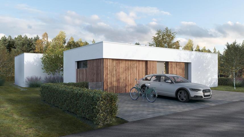 Moderný bungalov, ktorý podčiarkuje svoju eleganciu minimalistickým a čistým dizajnom. Dom ponúka prepojenie interiéru s exteriérom aj vďaka átriu, ktoré poskytuje súkromné sedenie priamo z obývacej miestnosti. Ďalšia terasa prepája exteriér s nočnou časťou domu. Spojenie kuchyne a obývacej izby ponúka vzdušný priestor aj vďaka strešným oknám, ktoré sú umiestnené nad kuchynskou linkou a jedálenskou časťou. Medzi dennou časťou a zádverím je veľké zasklenie so sklenenými dverami, ktoré nám umožňuje prepojiť aj túto časť domu s dennou. Nočná časť disponuje dvoma priestrannými detskými izbami a kúpeľňou s WC a rodičovskou spálňou so šatníkom a kúpeľnou s WC.