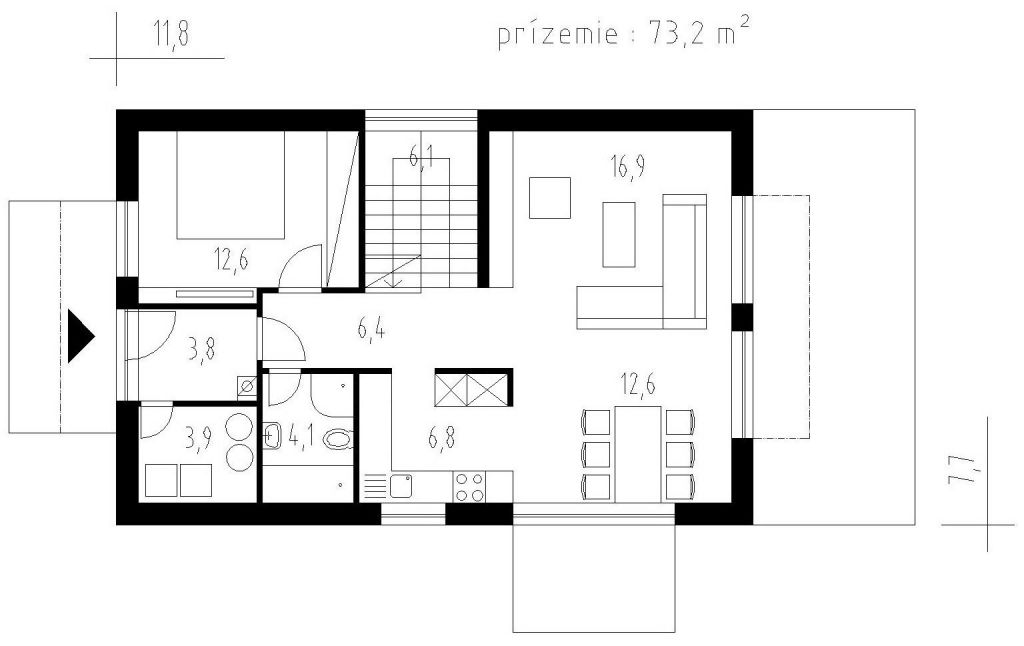 Klasický kompaktný dom so sedlovou strechou, oddelenou nočnou časťou na poschodí a dennou časťou na prízemí, ktorá obsahuje navyše ďalšiu izbu na rôzne využitie.