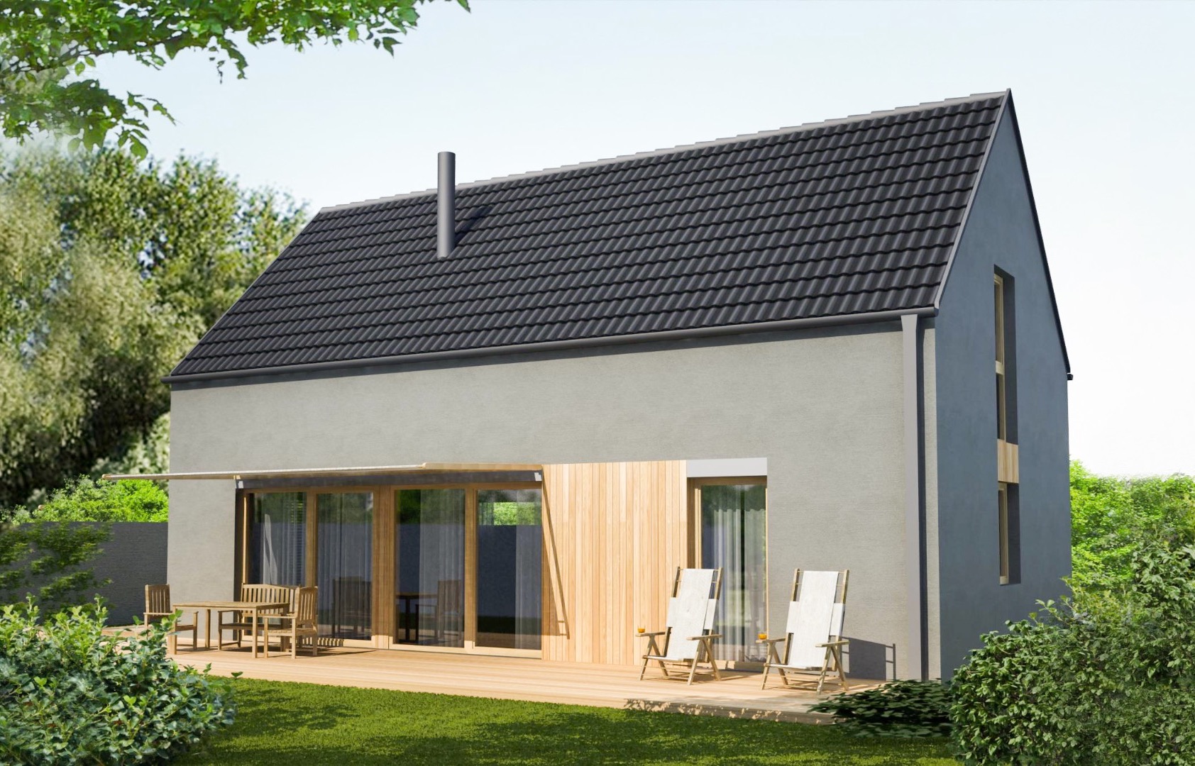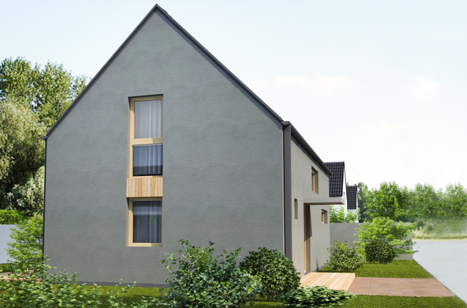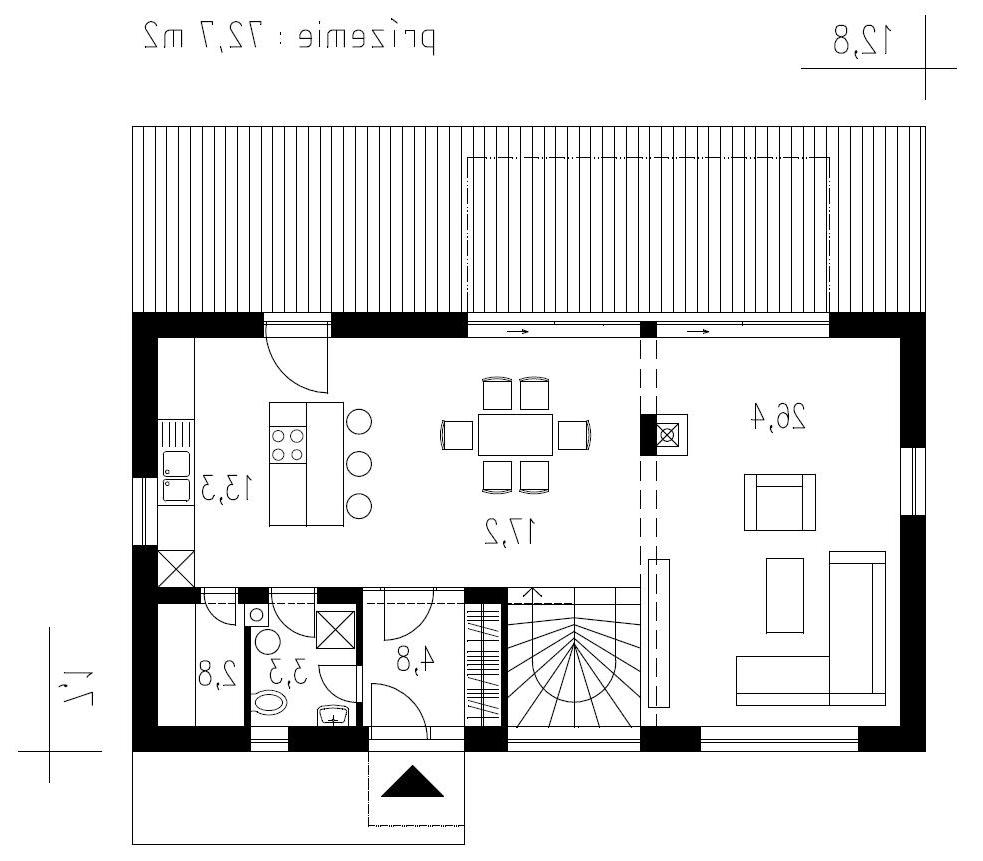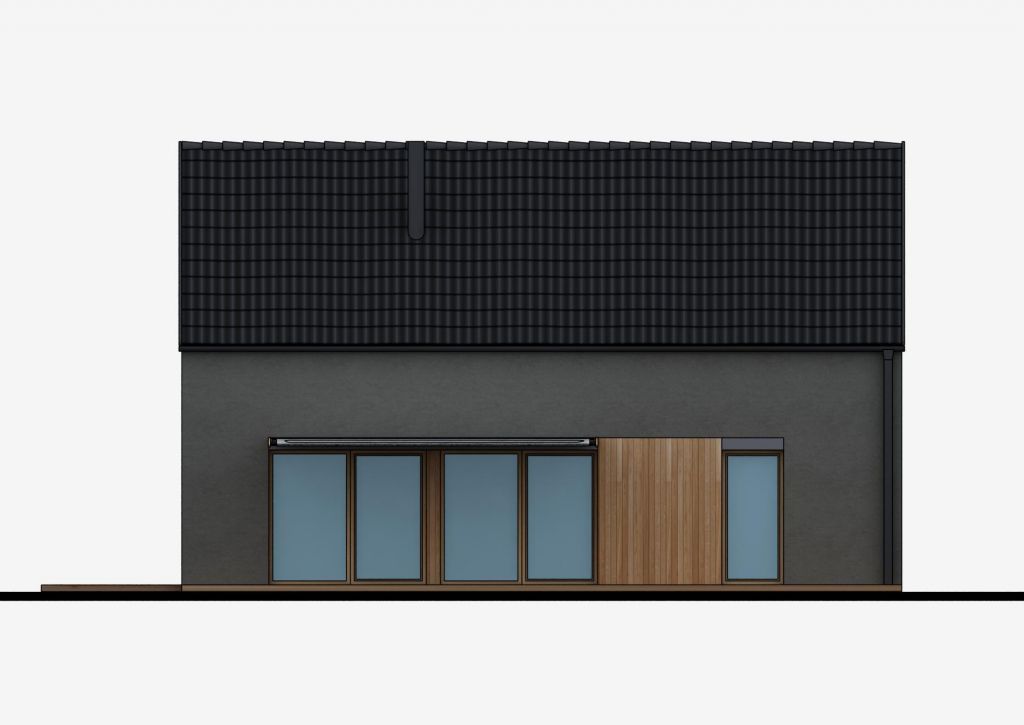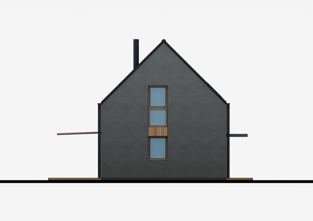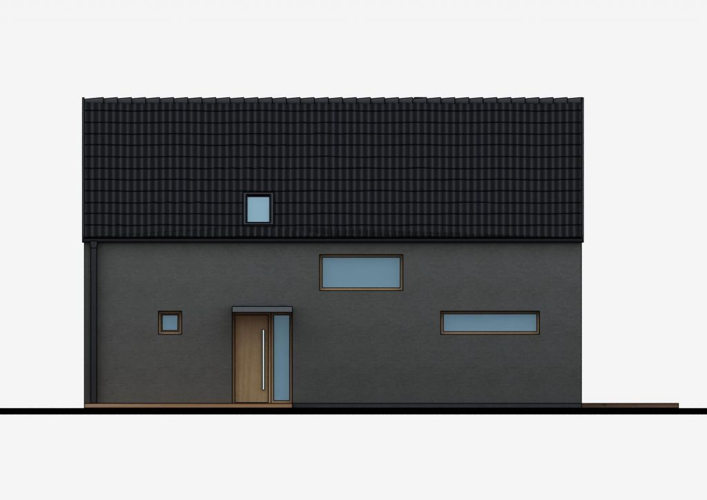Dvojpodlažný dom so sedlovou strechou, jednoduchou, no funkčnou architektúrou 4 izieb s 2 kúpeľňami a samostatným praktickým šatníkom na poschodí. Prízemie je plne využívané iba na denné funkcie. Nemá zbytočné priečky na prízemí a tak je pomerne vzdušný, napriek svojej malej šírke. Bočná fasáda sa otvára do exteriéru na terasu a vytvára dojem prepojenia do záhrady. Denná časť je jeden „veľkopriestor“, na jednej strane s kuchyňou, na strane druhej s obývacou časťou. Medzi nimi v centre dispozície, hneď za vstupným zádverím, sa nachádza jedálenský stôl, ktorý tak prirodzene preberá akúsi ústrednú spoločenskú funkciu v dome. Krbové teleso opticky oddeľuje relaxačnú časť od ostatnej časti domu. Kuchyňa má vlastnú malú špajzu. Na prízemí sa ešte nachádza malá technická miestnosť s príručným WC. Nočná časť domu je na poschodí, prístupnom otvoreným, sčasti točitým schodiskom, ktoré je zároveň dôležitým prvkom interiéru obývacej izby. Na poschodí sa nachádzajú 3 izby, kúpeľňa, samostatné wc a šatník. Spálňa rodičov má malý vlastný šatník v podkrovnom priestore. Priestory kúpeľne sú presvetlené strešným oknom. Dom je vhodný pre aktívnu rodinu, kde na pomerne malej zastavanej ploche dostávame príjemné bývanie