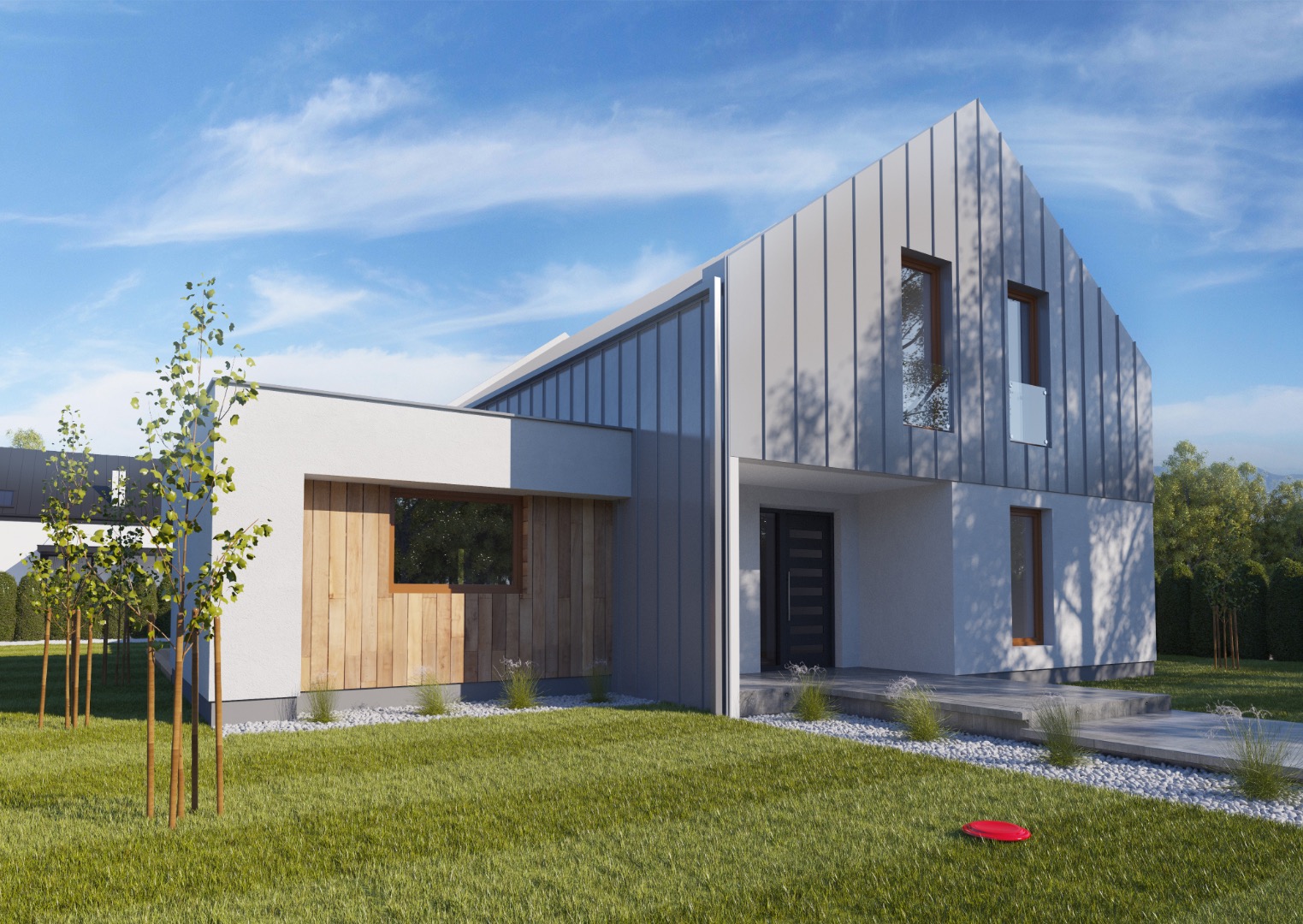 Tento poschodový dom na prvý pohľad zaujme svojim klasickým tvarom, ktorý je však obohatený modernými prvkami. Fasáda má pravidelný raster doplnený o podlhovasté okenné otvory. Výhodou je krytý hlavný vstup. Protiľahlá časť fasády vytvára intímny priestor s veľkými presklennými otvormi a na poschodí francuzskymi oknami. Priestor je doplnený o priestrannú terasu prepojenú s terénom. Ak máte širší pozemok a preferujete klasické sedlové strechy, môže sa stať práve tento dom vaším vysnívaným domovom.