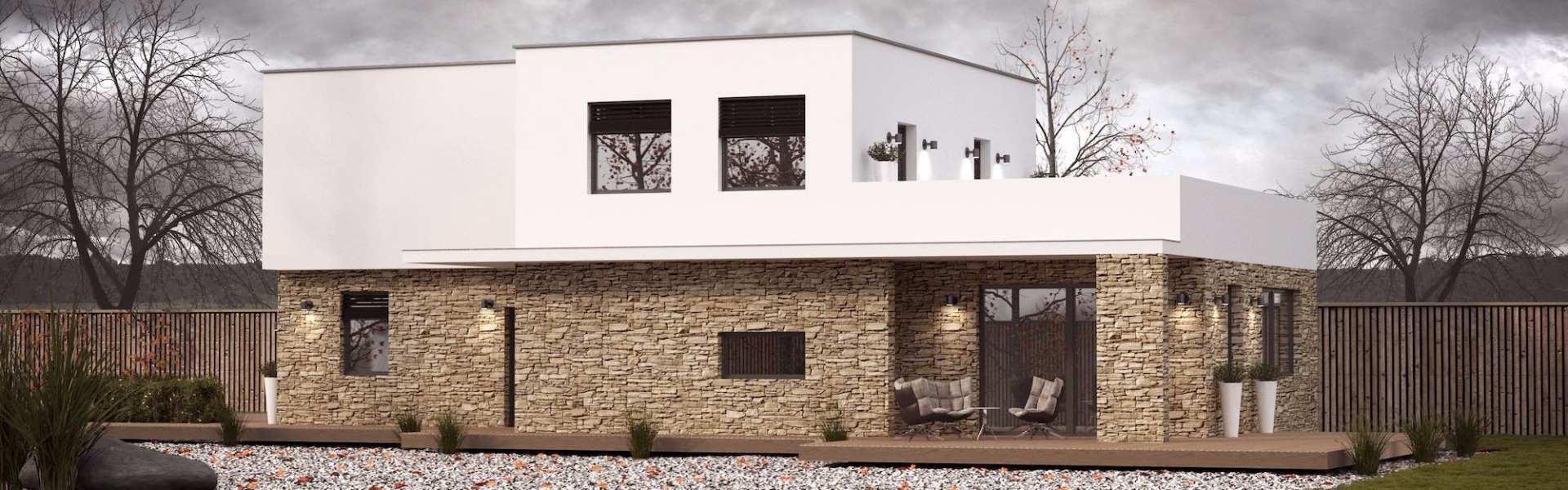 Tento poschodový dom predstavuje tvarovo jednoduchú architektúru, ktorá je zároveň veľmi čitateľná a moderná. Objekt dobre zapadne na dlhší a väčší pozemok. Je určený pre 4-5 osôb. Poschodia objektu sú vizuálne predelené odlišným materiálovým riešením na fasáde. Prízemie ponúka dennú časť, kde je situovaná priestranná kuchyňa s obývacou miestnosťou a ďalšia izba, ktorá môže v priebehu času rôzne meniť svoju funkciu - napr. hosťovská izba, pracovňa, spálńa, keďže aj na prízemí je plnohodnotná kúpeľňa. Celé druhé podlažie ponúka tri priestranné izby nočnej časti a kúpeľňu, pričom z dvoch spální/detských izieb je priamy vstup aj na terasu orientovanú do záhrady.