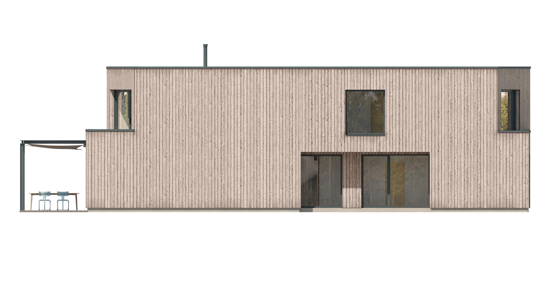Dom s plochou strechou vhodný aj na veľmi úzke pozemky je dizajnovo vyriešený tak, aby zapadol do existujúcej, ale aj novej zástavby. Svojím minimalistickým riešením a veľkými okennými otvormi vytvára vkusnú architektúru. Na prízemí je situovaná spálňa napojená na kúpeľňu a dennú časť. Obývačka s kuchyňou tvoria jeden veľký vzdušný priestor. Benefitom tejto časti je prepojenie so záhradou. Podlažie je navrhované ako nočná časť s dvoma izbami, pričom väčšiu spálňu je možné zónovite deliť a vytvoriť tak priechodziu izbu. Chodba je využívaná z veľkej miery ako úložný priestor, kde je možné vytvoriť sedenie v okne.