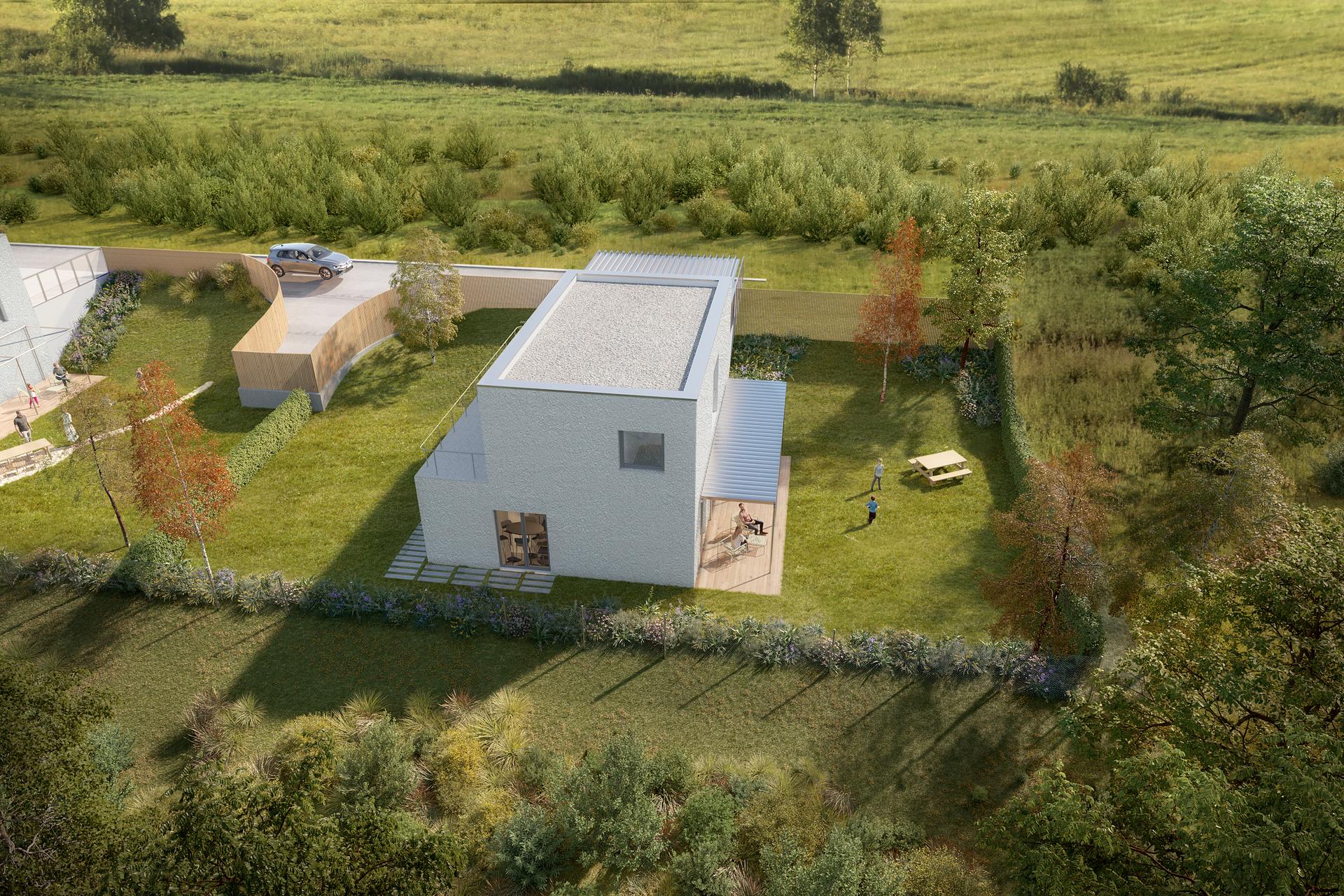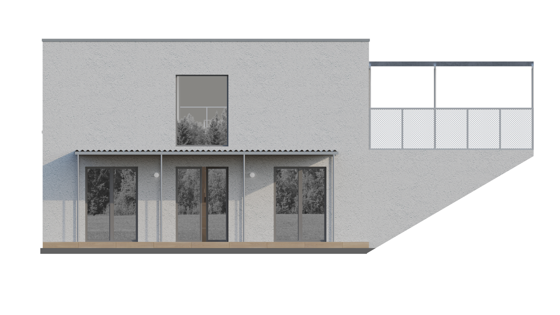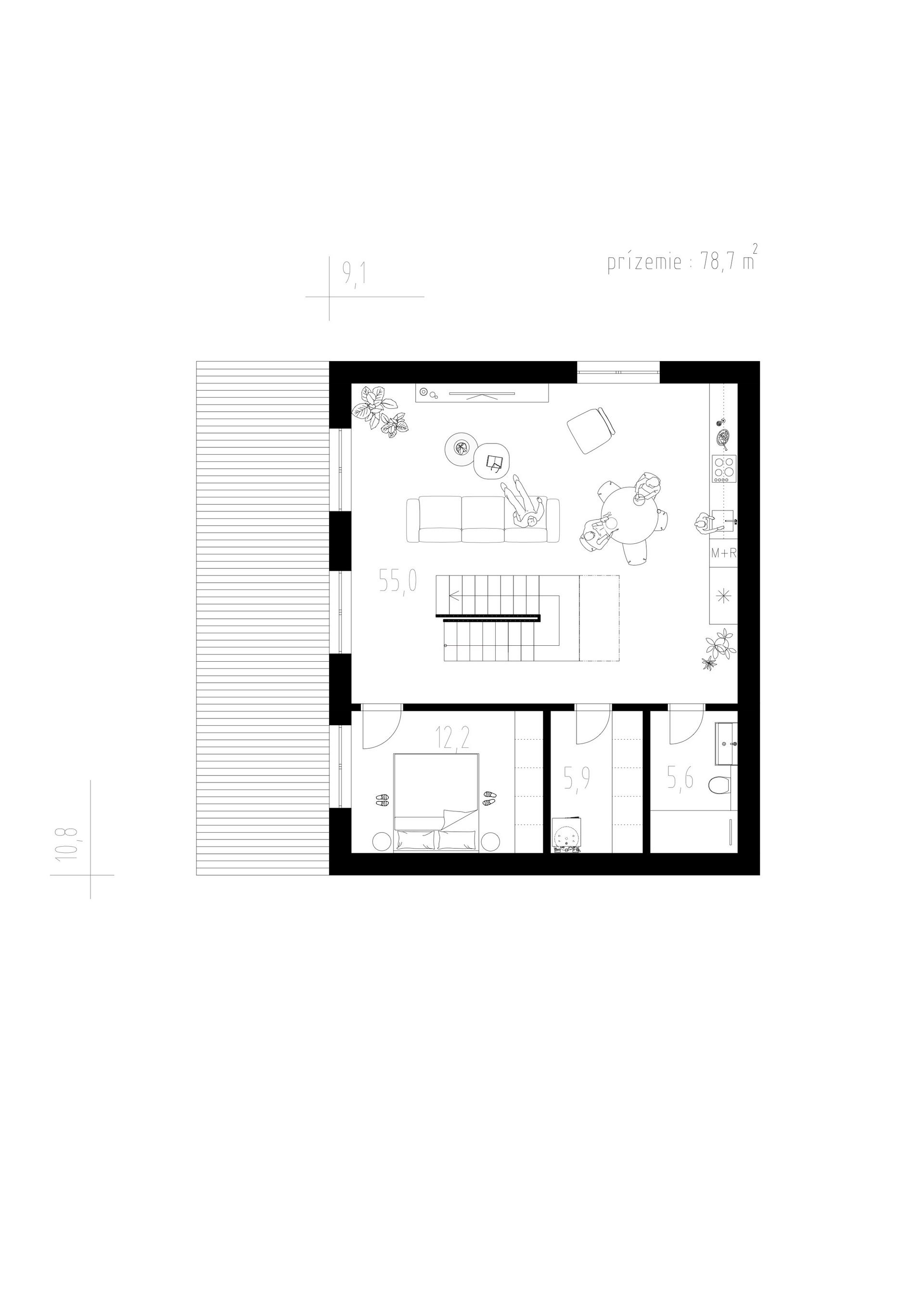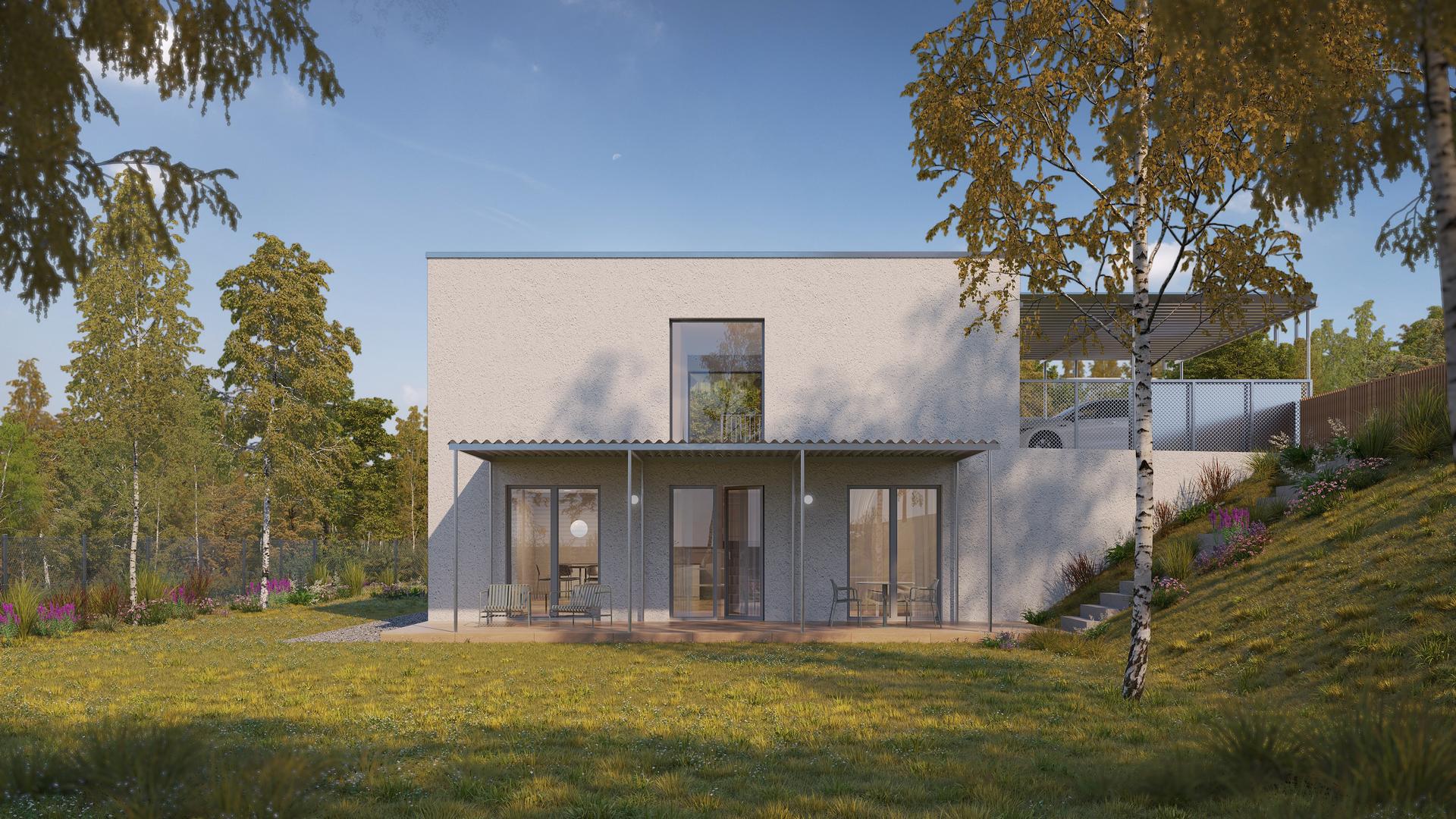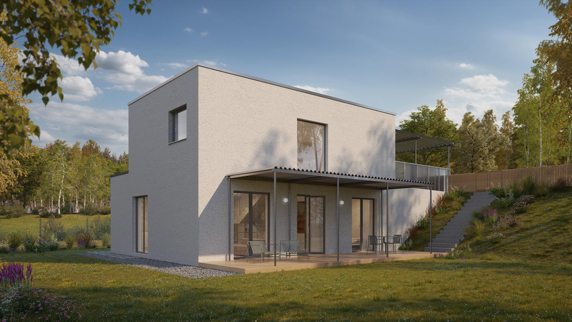 Rodinný poschodový dom je navrhnutý s dôrazom na maximálne využitie svahovitých pozemkov. Vstup do domu je situovaný na hornom podlaží, priamo do nočnej časti, čím sa prirodzene rešpektuje terén a zjednodušuje prístup. Denná časť je orientovaná smerom do záhrady a výrazne otvorená na jednu stranu vďaka veľkoformátových presklených plôch. Toto riešenie prináša do interiéru dostatok prirodzeného svetla, zároveň však zachováva vysokú mieru súkromia a komfortu bývania. Architektonicky zaujímavým prvkom je obdĺžnikový otvor nad schodiskom, ktorý sa otvára až po strop druhého nadzemného podlažia. Vďaka tomu je schodisko prirodzene presvetlené počas celého dňa a stáva sa výrazným vizuálnym prvkom interiéru. Návrh domu zároveň minimalizuje potrebu oporných múrov, čím optimalizuje náklady na výstavbu aj zásah do terénu. Pred vstupom je možné uvažovať s doplnením prestrešenia parkovacích miest, ktoré zvyšuje komfort každodenného užívania.